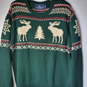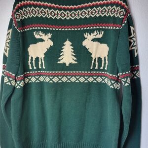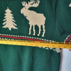 Cozy green sweater with festive moose and tree patterns. Perfect for winter warmth used excellent condition