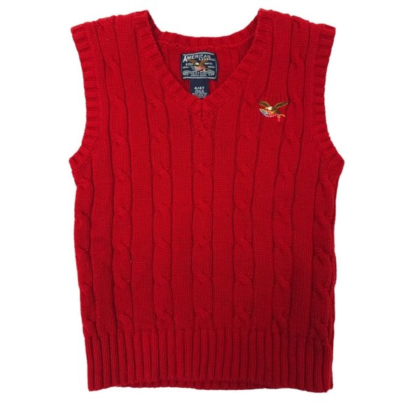 American Living Cable Knit Sweater Vest Boys 4/4T V Neck Pullover Red Eagle Flag