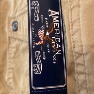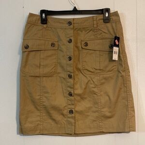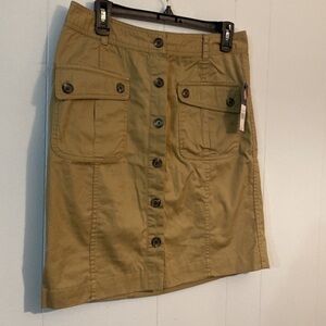 Stylish khaki skirt with button-front design. Features two front pockets. Perfect for casual wear.