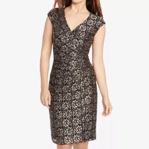 A beautiful and glamorous dress with a flattering fit in a metallic black and champagne floral lace.