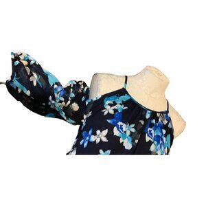 This pretty dress is from American Living in a women's size 12. Fully lined, made of polyester. Blues, white and grays in a pretty print. Has a hidden zipper at the back and a relaxed fit. Features a cold shoulder design. Sleeve cuffs have a little button. Unstretched, measured from seam to seam across the front: