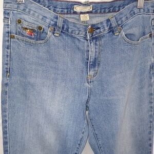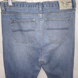 These jeans are in gently used condition. They are a heavier weight denim. The material has some stretchiness to it. These jeans look like they came from the late 90's or early 2000's. They have a broken in feel to them. Exact age unknown. Some wear on backs of heels. Please see photos for details.