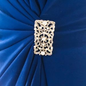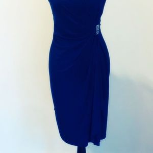 Vibrant Blue American Living wrap dress. Size 18. Like-new condition. Nice stretchy material. Beautiful rhinestone brooch where the dress wraps on the side.