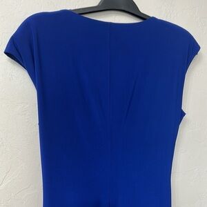American Living blue wrap style v neck sleeveless dress with silver broach size 10. Great condition.Length is 40” and chest is 17”. Laying flat waist is 12”.Has shoulder pads.