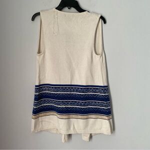 White and Blue color. Knit cozy. Sleeveless. Long length down to hips. Pockets on the front. Open front.
