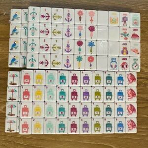 Bright travel-themed mahjong set featuring umbrellas, suitcases, bamboo, and playful vacation icons. Designed for fun, portability, and easy play at home or on the go.
