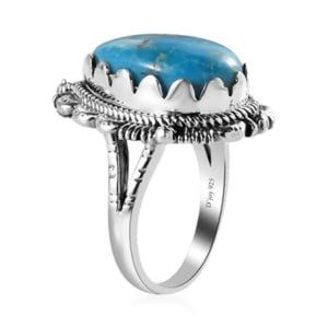 This American natural Blue Ridge turquoise ring features a stunning pear-shaped solitaire turquoise center gem. The precious turquoise gem is protected in a solid 925 Sterling Silver crafted intricate rope-like pattern and also features a split shank that also adds to its exquisitely crafted and distinctive look. American natural Blue Ridge turquoise is the latest variety of turquoise from the Blue Ridge Mine. It is highly prized by collectors and high-end jewelry crafters.