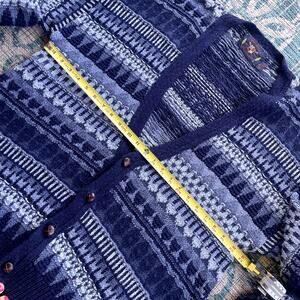 Embrace ultimate 90s vintage style with this fantastic cardigan sweater by American Portrait. Proudly made in the USA from 100% cotton, this piece features a highly textured, geometric knit pattern in shades of blue, giving it that classic "Grandpa" or "Cosby sweater" aesthetic. It's the perfect cozy and stylish layering piece for autumn and winter. Features a V-neck, full button front, and ribbed cuffs and hem for a comfortable fit. A true vintage gem!