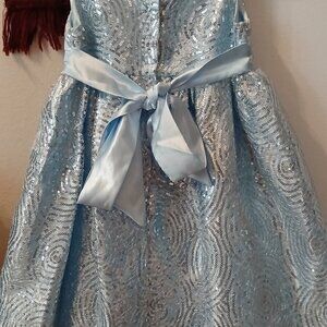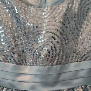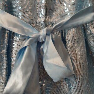 Sleeveless round neck with blue satin pleated ribbon empire dress.