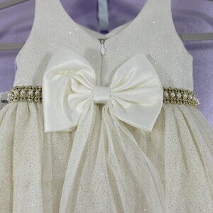 Adorable American Princess special-occasion dress in candle-gold sparkle, featuring a glittery sleeveless bodice, pearl-and-rhinestone embellished waistband, and a beautiful multi-tier tulle skirt. The back includes a satin bow and hidden zipper for an elegant finish. Perfect for holidays, birthdays, weddings, and photos. New with tags and in excellent condition.