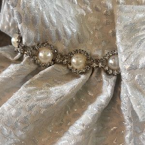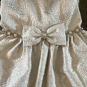 Worn once size 7. Dress has a Pearl and rhinestone detail with bow on the front and a tie in the back. Dress is lined and also has netting for additional body on skirt. Design on dress is a mosaic in a matching metallic threading. Matching smaller dress in size 6x in my listings.