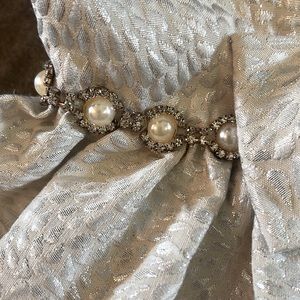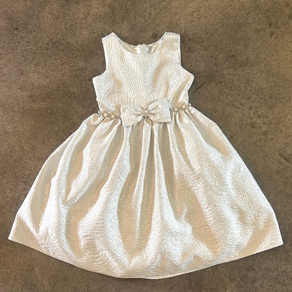 additional body on skirt. Design on dress is a mosaic in a matching metallic threading. Matching smaller dress in size 7 in my listings. Tag was cut out by zipper on bodice see pictures above.
