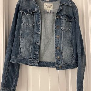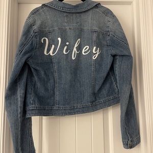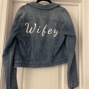 American rag light jean jacket with white glitter writing on the back. Worn twice