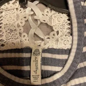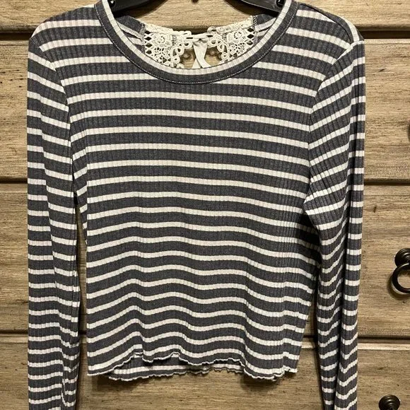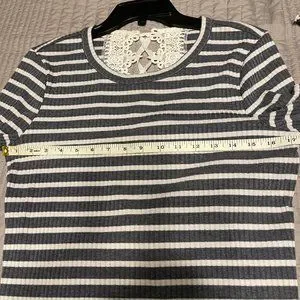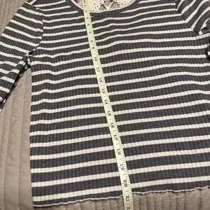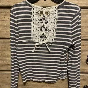 Totally adorable shirt, Gray/blue stripes and off white can be worn in multiple seasons.