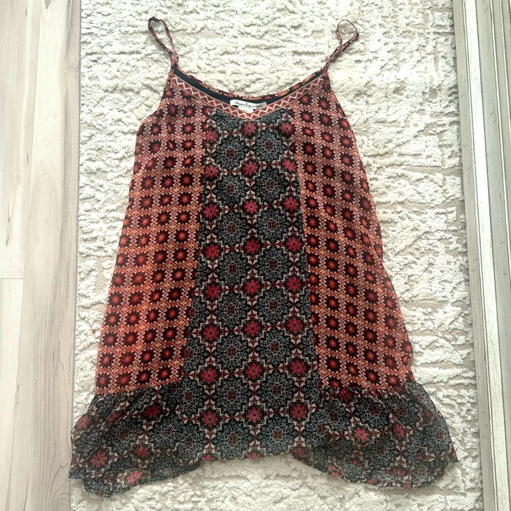 Spaghetti strap, thin, lightweight, multicolored sun dress. Built in cami