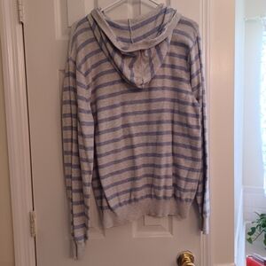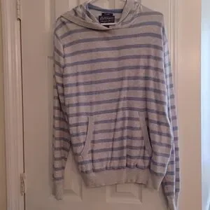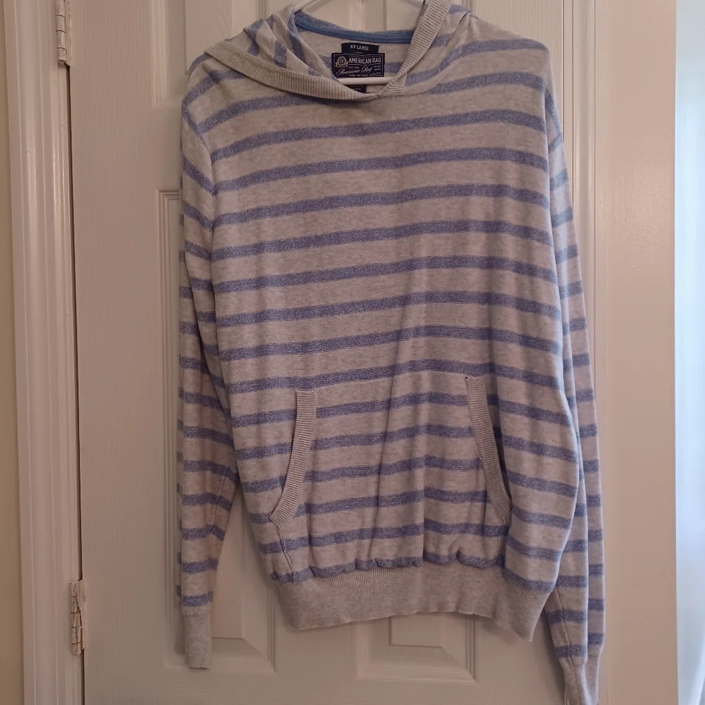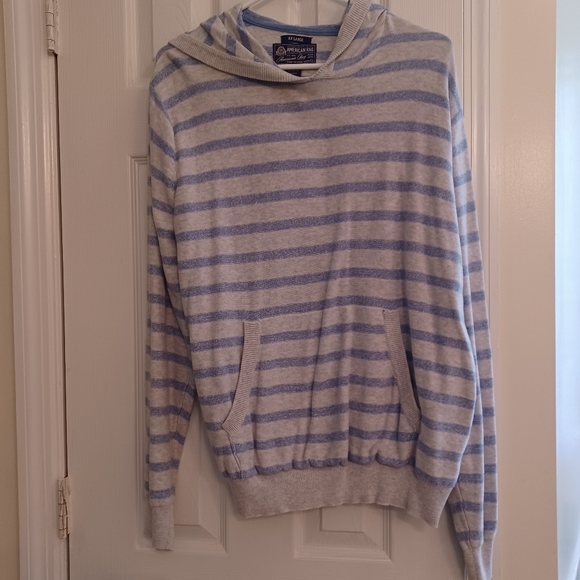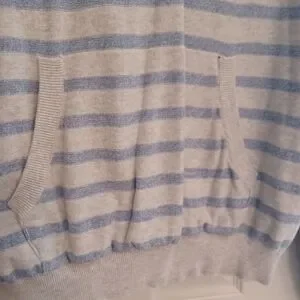 Mens pullover Hoodia like sweater with front kangaroo pockets. 199% cotton. Blue and light gray