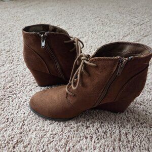 Dressed up or down, these American Rag Baylie booties give your style a bohemian lift. Features include a 2.75 inch wedge heel, a laced design and a round toe for comfort. Microsuede upper with a manmade sole. These chestnut brown booties will be your new favorite! Very gently used and in great condition.