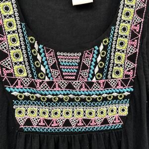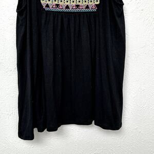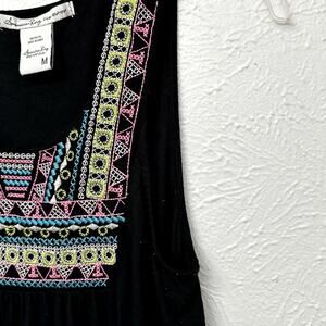 This is a lovely tank top from American Rag Cie. This black shirt features an embroidered chest/neckline in bright colors of pink, blue, yellow-green, and white. This sleeveless shirt is flowy.