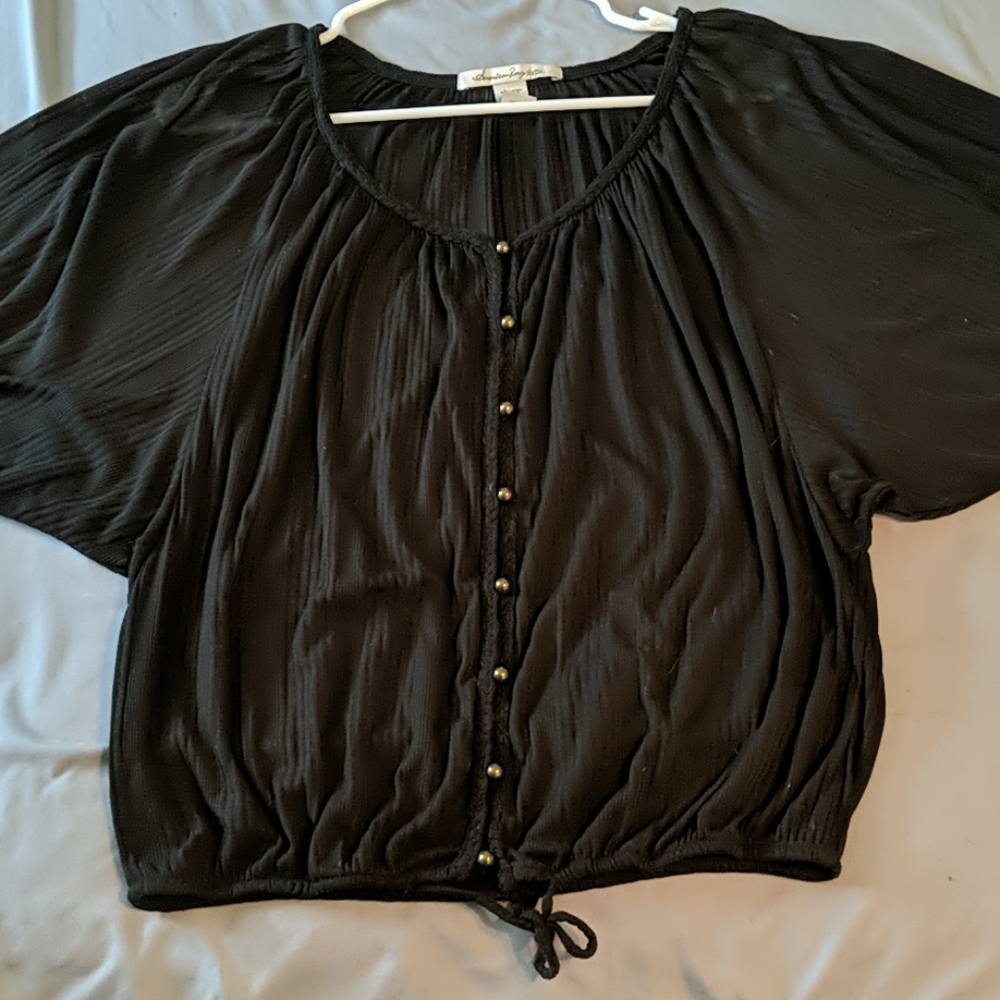 Black flowy blouse, baggy 3/4 arms, gold ball buttons down the front and drawstring at waist. Very comfy shirt