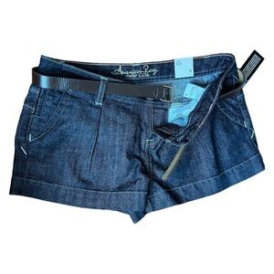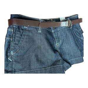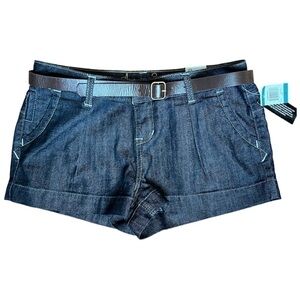 American Rag Dark Blue Cuffed Brown & Gold Belted Jeans Shorts Flap Pockets Juniors Size 9 NWT, Trendy Flap back pockets, American Rag Cie, 72% Cotton, 27% Polyester, 1% Spandex, Machine Wash, Comes with a brown and gold belt that has a nick on the edge as shown in photo. Mid rise Jeans, Zipper Closure, 5 Pocket Design.