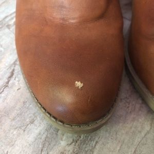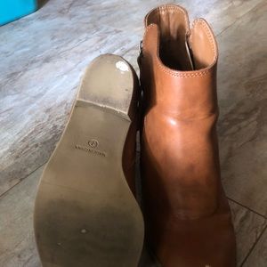Brown booties with functional zippers on either side of the shoe, slightly worn in the toe of the right foot otherwise great condition!
