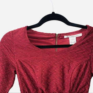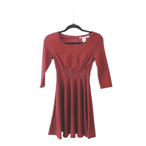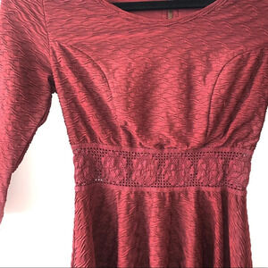 American Rag CIE maroon lace fit & flare dress. In excellent condition! Slightly scoop neckline. Cropped sleeves. Beautiful lace inset along the waistline, which is slightly see through. Lifted embroidery throughout the dress. Fitted on the top & flares out below the waistline. Mini silhouette & lined. Gorgeous light maroon/red color, perfect for fall!