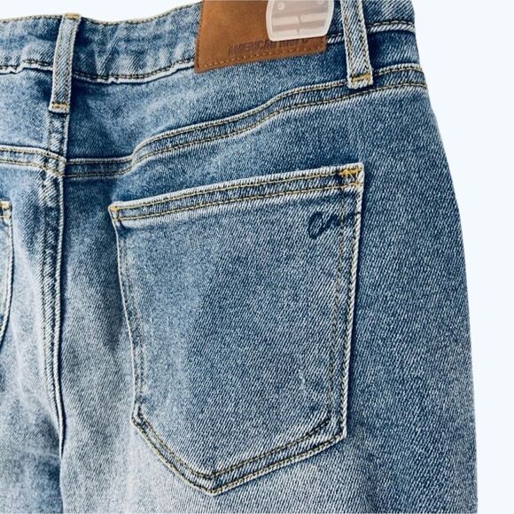 Medium blue denim bootcut/flare distressed jeans. Raw hem. 5 pocket. Button/zip fly. Cotton/spandex fabric. In excellent preowned condition. American Rag CIE Size 7