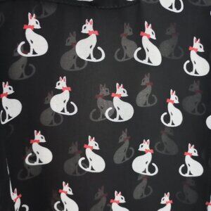 American Rag Cie kitty cat print blouse, white cats with red bow on black background. Sheer georgette fabric, button front with longer ends to wear tied, long sleeves. Cute shirt perfect for cat lovers with a touch of whimsy.