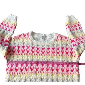 Women’s size large fuzzy soft bright pink and yellow patterned sweater from American Rag. This sweater is in excellent pre-owned condition. Please see photos for measurements.