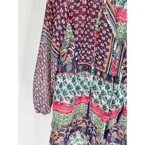 This American Rag Cie floral boho tunic top blends effortless style with a free-spirited touch. Designed with a keyhole neckline and long sleeves, it offers a flattering and relaxed fit. The lightweight fabric drapes beautifully, making it perfect for casual outings or layered looks. In size M, this tunic’s vibrant floral print adds a chic, bohemian vibe to any wardrobe.