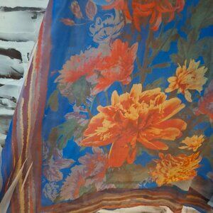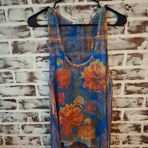 American Rag Cie sheer tank top with a scoop neckline. Blue with a floral design. Medium.