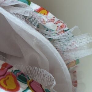 Skirt has loose pleats around the waist and a built in slip with a polyester net ruffled hem.