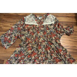 American Rag Cie Plus 2X Floral Boho Peasant Blouse Sheer Lace Yoke Button Front