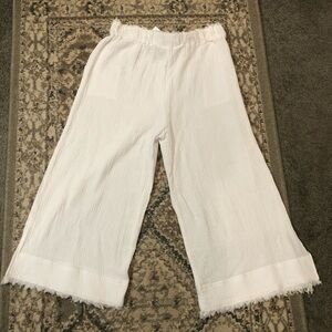 Stylish white wide-leg cropped pants with a frayed hem. Perfect for casual outings. Made of Cotton Gauze material. New with tags. Has elastic tie waist. Waist measures 30” before it stretches, hips 44”, rise 12.5”, inseam 21”.