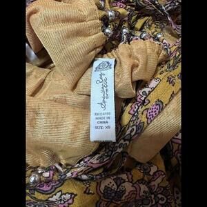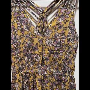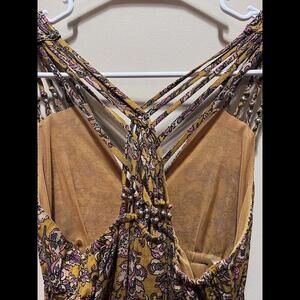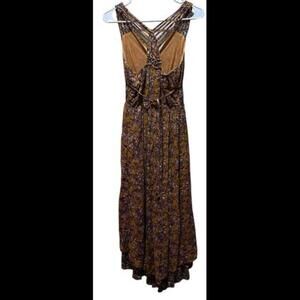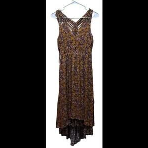 This is an American Rag Cie Boho strappy midi dress in size Extra Small. It is sleeveless with a bohemian style, featuring a multicolored design with gold accents. Perfect for a casual and stylish look, this dress is ideal for women looking for a trendy and comfortable outfit option.
