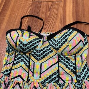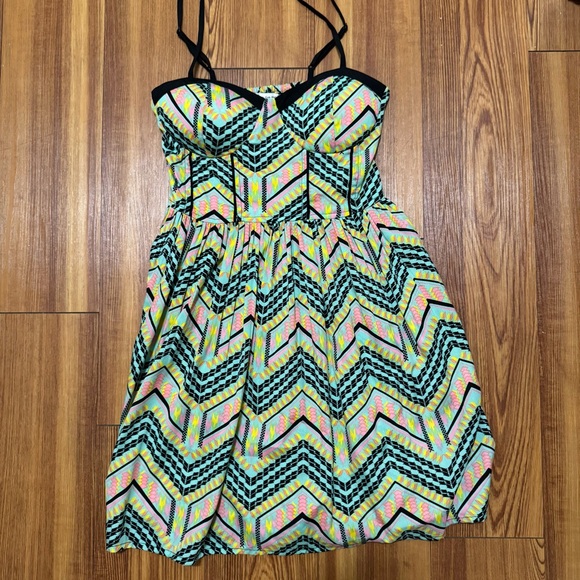 Vibrant dress with a chevron pattern. Features black, yellow, pink, and blue colors. Perfect for a stylish look. Only worn a couple times. In very good condition.