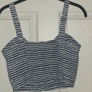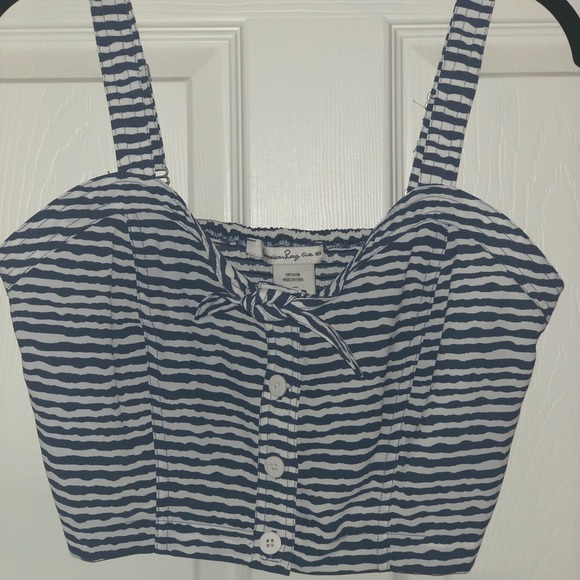 Navy blue and white striped crop top. Thick adjustable straps. Closes in the front with buttons.