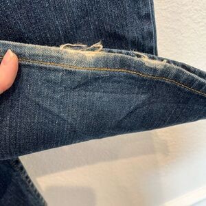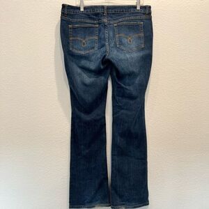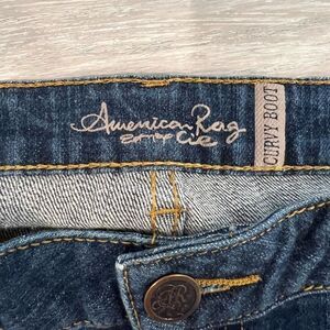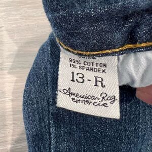 Pre-owned American Rag Curvy Boot Juniors Denim Jeans in 13-R Fraying on back of the hems (pictured).