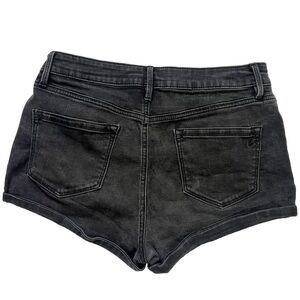 Classic pair of dark wash jean short shorts with cuffed hems. Attractive black matte button closure and functional standard side and back pockets.
