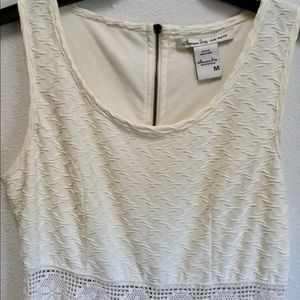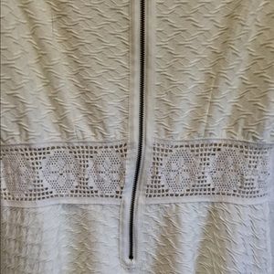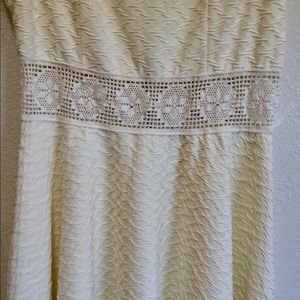 This is an off-white dress with a crocheted designed center at the waist. This dress has only been worn a few times. In great condition.