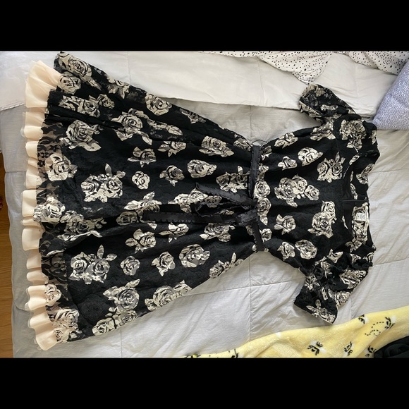 Knee length American Rag dress in size medium. Floral lace overlay with white rose print, rouching on the sleeves, and a ribbon like belt.