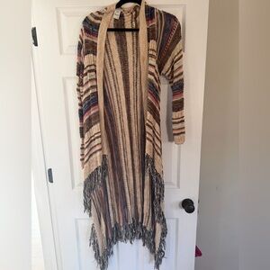 Stay cozy and stylish with this multicolor striped asymmetrical hem long cardigan sweater. Perfect for layering, this sweater features a blend of warm tones and fringe detailing for a boho-chic look. EUC, size L