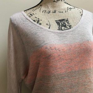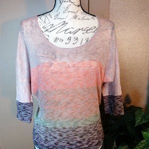 American Rag scoop neck top in beautiful muted ersth tone colors of tan, salmon, brown and sage. 3/4 sleeve. Stretch band at hem. Marked a size L but depending on desired fit could fit S, M or L. Laying flat: 23" pit to pit; 23" length; 16"" at bottom with stretch to 18". 73" polyester 27" rayon. Perfect top for Spring, Summer and Fall seasons! Excellent condition.
