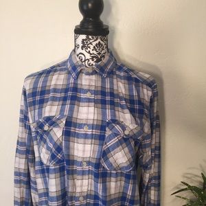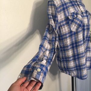 American Rag flannel. This comes in a women’s size medium. It hosts a plaid pattern with the colors blue, gray, white and a bit of baby pink. This top buttons down. The front pockets as well have buttons. The sleeves also button. This top is in excellent condition. Material 100% Cotton