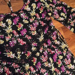 Floral Dress, ties in back. Coordinates the colors purple, black, yellow, and green. Beautiful on. Brand new, never worn!