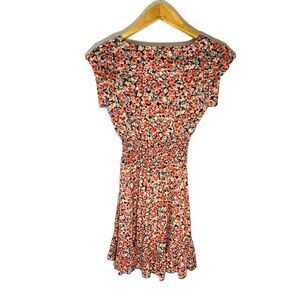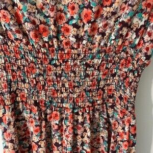 Cute dress with floral pattern in shades of orange, teal, brown and cream. it features a smocked waist and bottom flounce. Excellent condition. Reasonable offers considered.