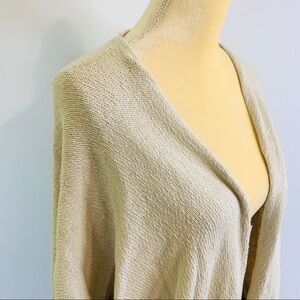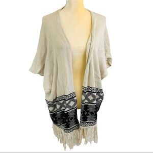Fringe Duster cardigan. Open front. Fringe hem. Cream colored with black design lining bottom hem. Oversize sleeves.
