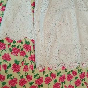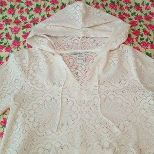Never worn!!! NWOT, cream color, hooded top, 3/4 sleeve, scalloped detail along bottom and sleeves. Drawstring detail has an awkward twist in the right string (as shown in last pic). It is probably a simple fix but i dont want to mess with it and ruin it before selling 😂 it was purchased that way, so i am just noticing.