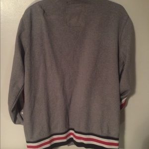 This is a used brand new men’s in great condition jacket. The size is medium. The color is grey, red, black and white. There are two pockets on the rt and left side of the jacket.