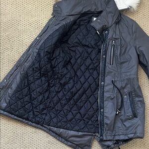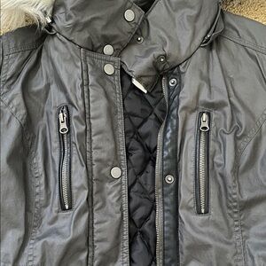 Charcoal winter jacket with removable fur-trimmed hood. Features multiple pockets and drawstring waist. Ideal for rain and to keep warm. Lightly worn and in great condition!